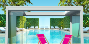 La pergola Néo est une pergola à toile avec finition optionnelle par lames orientées fixes